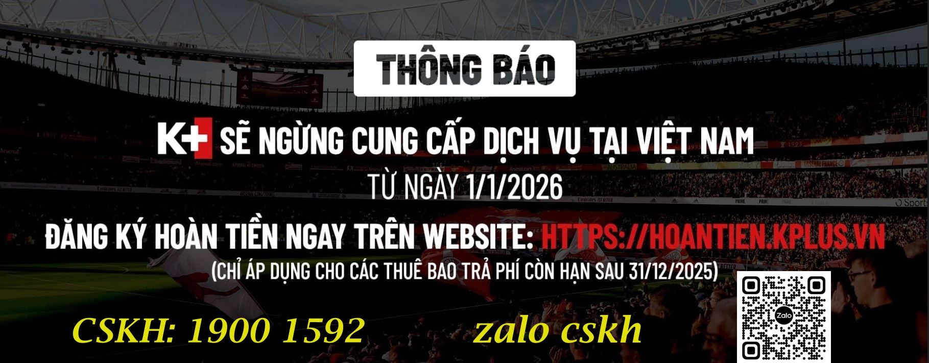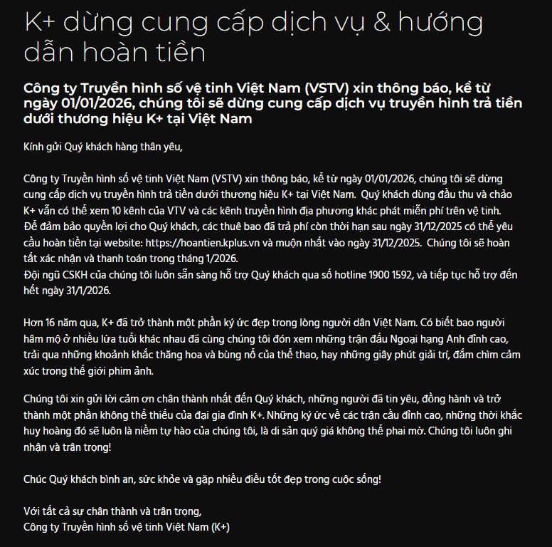 Thông báo quan trọng về việc ngừng cung cấp dịch vụ và hoàn tiền thuê bao K+ từ 8-12-2025